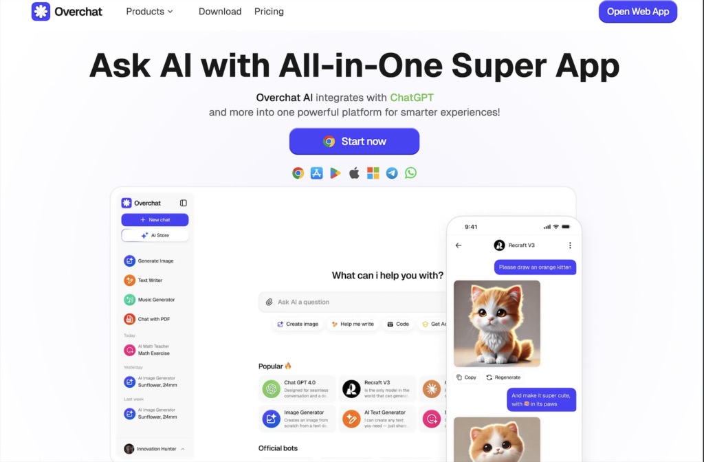 Overchat provides a user-friendly dashboard integrating multiple AI models with both free and paid tiers.