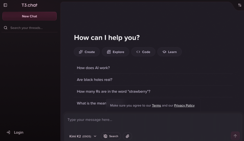 Available primarily as a web application with plans for a t3 chat mobile app, the t3.chat ai platform targets developers and tech-savvy users who discovered it through theo browne t3 chat’s YouTube channel or the T3 community. The platform emphasizes affordability and simplicity, deliberately keeping the t3 chat price low to attract users tired of paying $20-30/month for individual AI subscriptions.